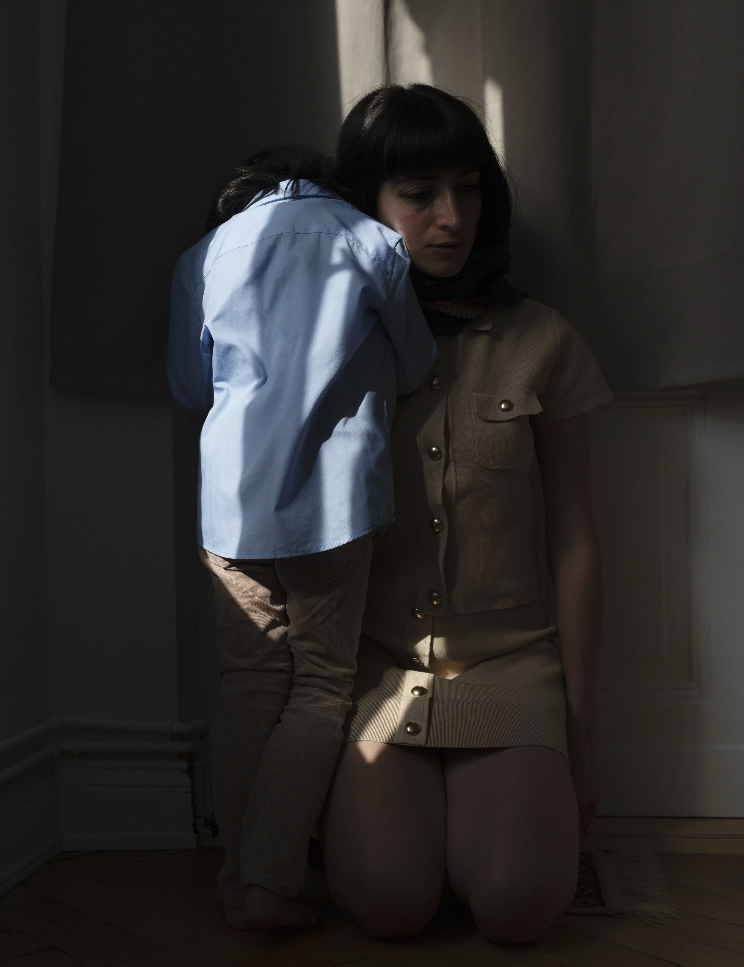 dressed in blue. They seem to want to escape, to free themselves, but they are being held down.
